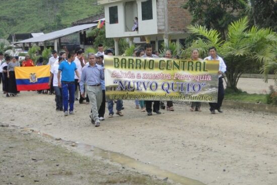 Por los años 1970 los jefes de familia provenientes de lo que hoy es el cantón Calvas, provincia de Loja, después del soportar la sequía, inician un viaje en busca de tierras más productivas, recorriendo caminos de herradura y un extenso río, que años después se conocería como el Río Nangaritza, y se encontraron con terrenos ya habitados por los Shuar, los terrenos fueron negociadas y comprados para luego formar la comunidad de Nuevo Quito, cuyo nombre se debe a que la fecha de creación coincidía con la fundación de la capital del Ecuador “Quito”.